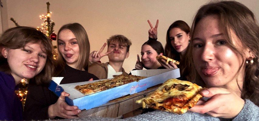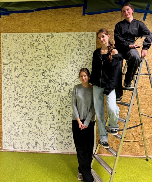 🧑🎨 Die große finale Aktion: Jetzt musste an einem Freitagnachmittag die Vorlage an die Wand. Geplant waren Pinsel und schwarze Farbe – entschieden haben wir uns dann aber für Edding: präziser, sauberer und perfekt für die Comiclinien. Die Partypizza hat uns die nötige Power gegegeben.