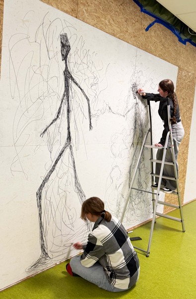 Wir haben uns zu zweit zusammengetan und unsere Figuren in einer gemeinsamen Großzeichnung zusammengebracht.