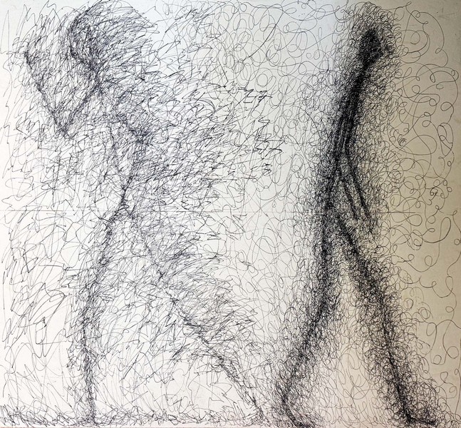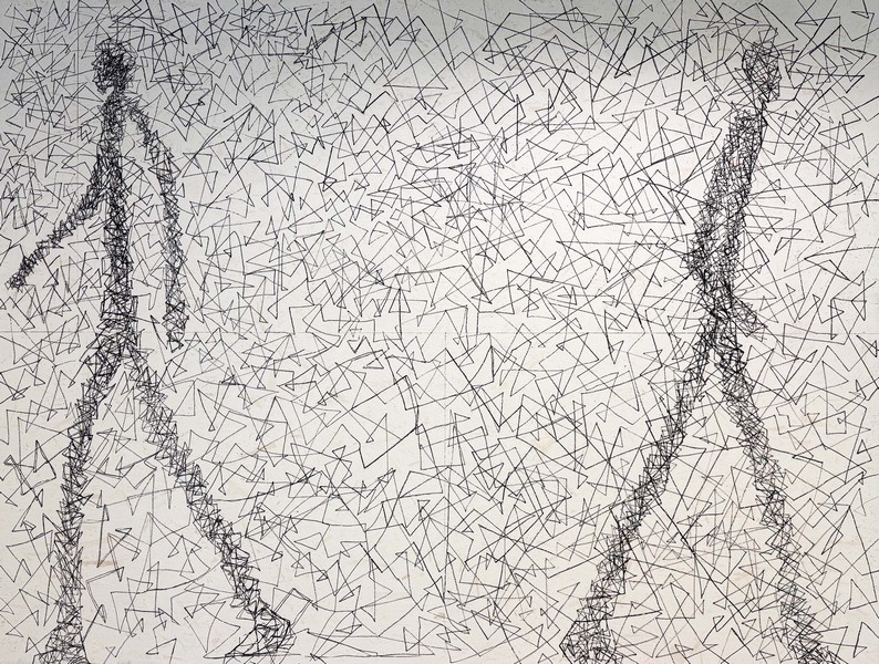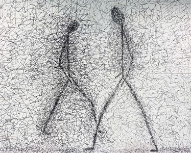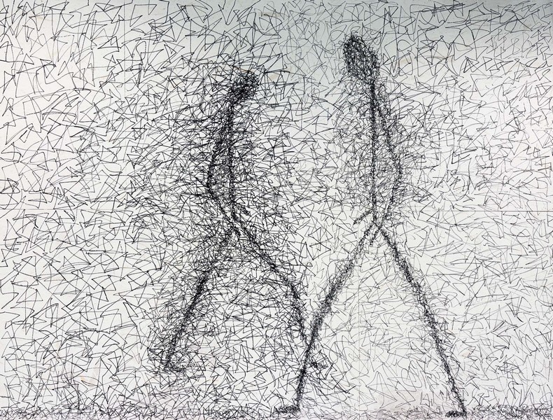 Keine realistischen Körper, sondern reduzierte, verlängerte Gestalten – irgendwo zwischen Bewegung und Stillstand.
