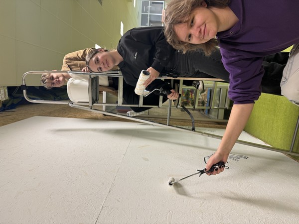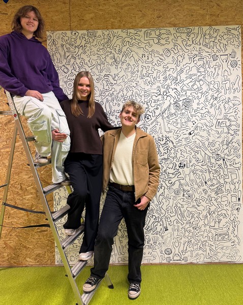 🧑🎨 Die große finale Aktion: Jetzt musste an einem Freitagnachmittag die Vorlage an die Wand. Geplant waren Pinsel und schwarze Farbe – entschieden haben wir uns dann aber für Edding: präziser, sauberer und perfekt für die Comiclinien. Die Partypizza hat uns die nötige Power gegegeben.