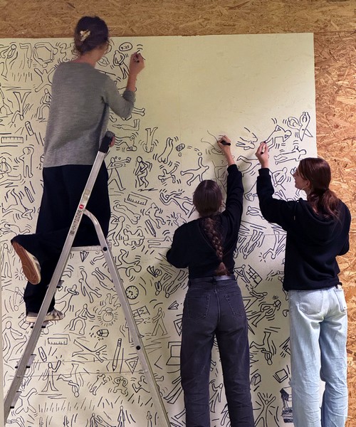 Wir sind acht Schüler aus dem 11. Jahrgang, die sich freiwillig für dieses Kunstprojekt gemeldet haben – immer nach Schulschluss, immer mit guter Stimmung, Snacks und Musik. Unser großes Ziel: Zwei Wandabschnitte der Schule mit einem eigenen Wimmelbild gestalten, inspiriert von Keith Haring. 🕺💥